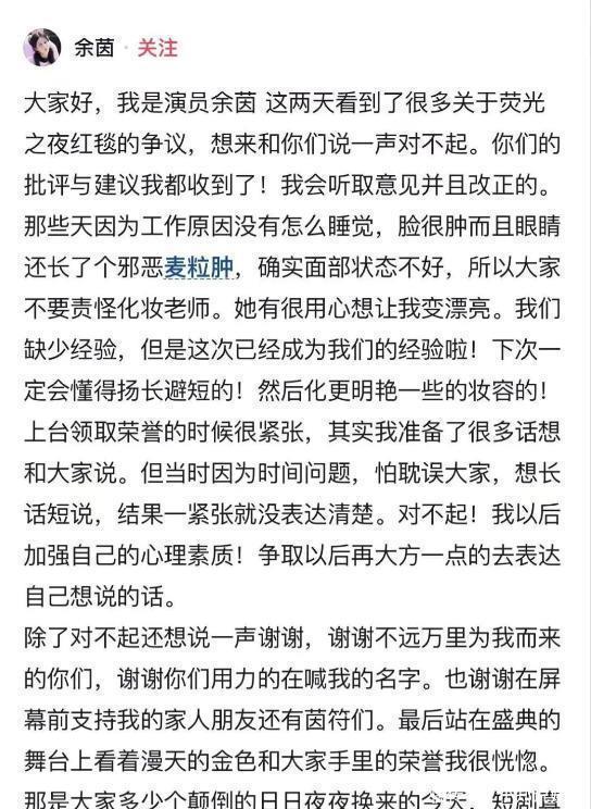 凭借着《好一个乖乖女》走红的余茵,事业本应该一路坦途,却因为一个红毯的小插曲被吐槽。确实是让人觉得有点悲凉。不过好在本人积极回应,坦然面对,确实表现的很有力量!